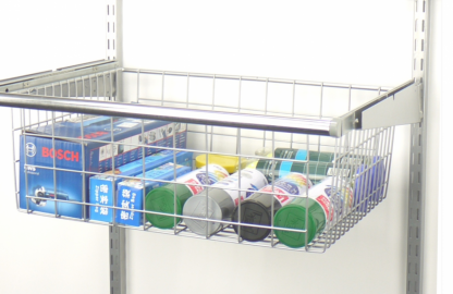 Выдвижная корзина отлично экономит место. Ее можно разместить прямо под полочной панелью. Крепится на вертикальные направляющие.