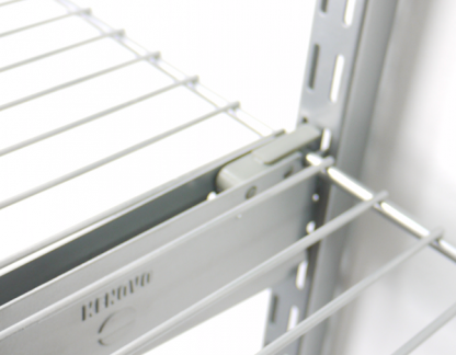 Кронштейн монтируется на вертикальную монтажную полосу. На одну полосу можно смонтировать несколько кронштейнов с необходимым шагом. На кронштейн можно закрепить проволочную полку или использовать его для хранения длинномерных предметов - досок, труб и т.д. Специальный механизм запирает и удерживает полку для безопасности. Выдерживает вертикальную нагрузку до 30кг на крайнюю точку. Таким образом, если нужно увеличить максимальную нагрузку на полку, нужно спланировать дополнительные кронштейны и вертикальные направляющие. Также можно подвесить штангу на специальных крюках, под кронштейн, для гардероба.