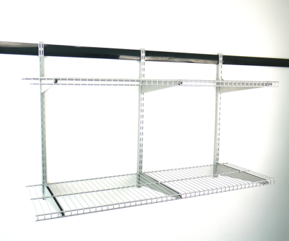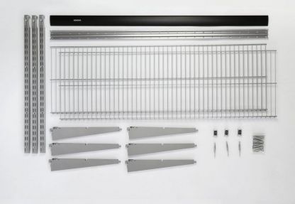 В комплект входит: направляющая, полосы, размещаемые вертикальным способом, крепежи, кронштейны. Помимо кронштейнов, может быть установлена штанга для хранения одежды на вешалках. Кроме того, имеются рифленые подкладки. Набор из двух полок обойдется дешевле, чем их приобретение по отдельности.