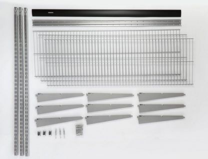 В комплект входят три полки. Каждая из них способна выдерживать вес до 100 килограмм. Но для этого, также необходимо обеспечить установку с соблюдением всех рекомендаций. Она выполняется несложно, но стена должна быть надежной. Полки монтируют на любую высоту. Наборы для гардеробных комнат содержат все необходимое для этого: крепежи, направляющую, полосы для вертикального соединения, кронштейны, рифленые подкладки.