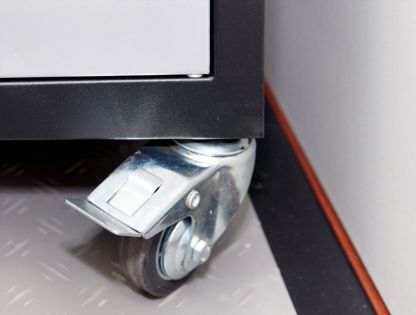 Металлическая подкатная тумба с двумя дверцами и двумя полками. Размер 800х700х460мм. Тумба оснащена четырьмя обрезиненными колесами с подшипниками. Два передних колеса с блокираторами. Внутри тумбы устанавливаются две металлических полки. На верхнюю часть тумбы можно прикрепить металлический лоток с резиновым ковриком CBDT или деревянную столешницу (приобретаются отдельно).