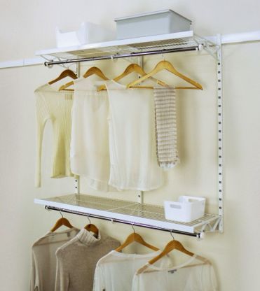 Набор для гардеробной комнаты. Ширина полок 1190мм, глубина 385мм. Высота вертикальных направляющих 1175мм. Полки и направляющие сделаны из стали покрытой прочной порошковой белой краской. Кронштейны полок и держатели штанги выполнены из алюминия, так же покрытого порошковой эмалью. Штанга для одежных вешалок (плечиков)сделана из стали покрытой хромом.