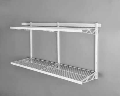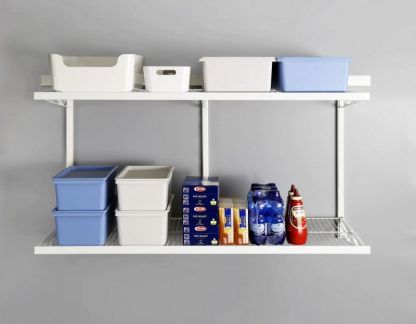 Набор из двух полок для гардеробной. Ширина полок 1200мм, глубина 385мм. Высота вертикальных направляющих 775мм. Полки и направляющие сделаны из стали покрытой прочной порошковой белой краской. Кронштейны выполнены из алюминия, так же покрытого порошковой эмалью.