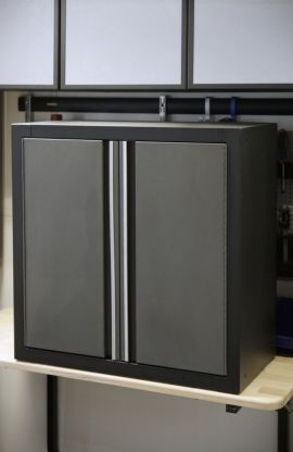 Металлический навесной шкафчик с распашными дверцами. Сталь 0.6 мм, цвет темно-серый/черный. Размеры: швг 710х710х360. Неразборная конструкция.