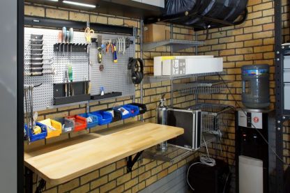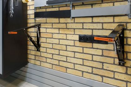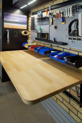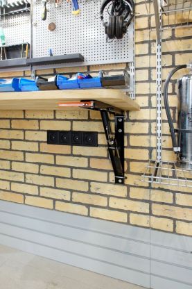 Складной стол - отличное решение для стеснённого пространства в гараже или подсобке. Прочная и твёрдая дубовая столешница великолепно выглядит и весьма функциональна. Плавный и надежный механизм складных кронштейнов будет служить вам долгие годы даже в непростых условиях гаража. Монтаж стола прост и легко может быть выполнен самостоятельно.