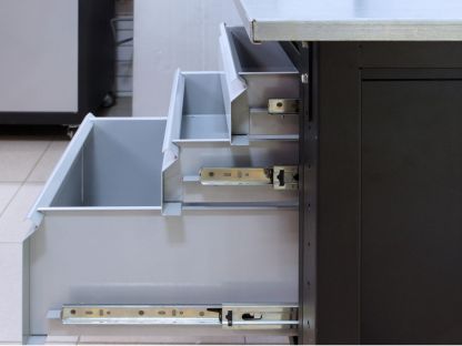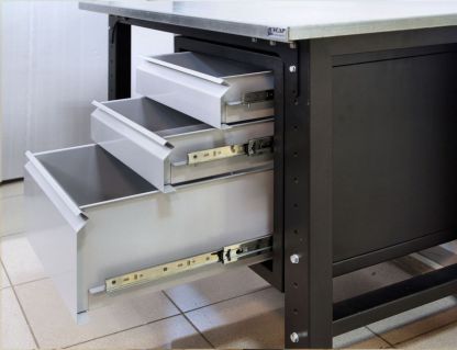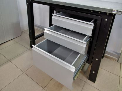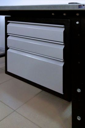 DWB3 - Подвесная тумба с тремя выдвижными ящиками, предназначена для встраивания в верстаки WB10, WB15, WB19. Оснащены роликовыми направляющими полного выдвижения. Тумба изготовлена из стали 1мм, имеет сварную неразборную конструкцию, окрашен порошковой эмалью.