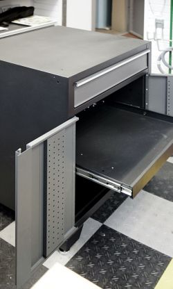 Металлическая тумба с двумя выдвижными ящиками и распашными дверями. Сталь 0.6мм, цвет темно-серый. Регулируемые ножки. Неразборная конструкция. Размеры: шгв 710х600х830(930)мм Производство КНР.